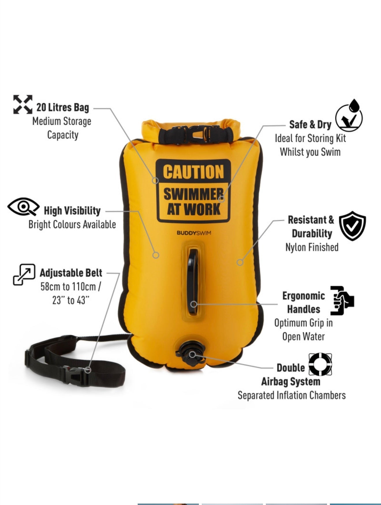 BUDDYSWIM Drybag Buoy má dve nezávislé vzduchové komory, aby sa bójka v prípade prepichnutia alebo straty vzduchu úplne nevyfúkla. Súčasťou balenia je BEZPLATNÁ žltá silikónová čiapočka na zvýšenie viditeľnosti plavcov vo vode.